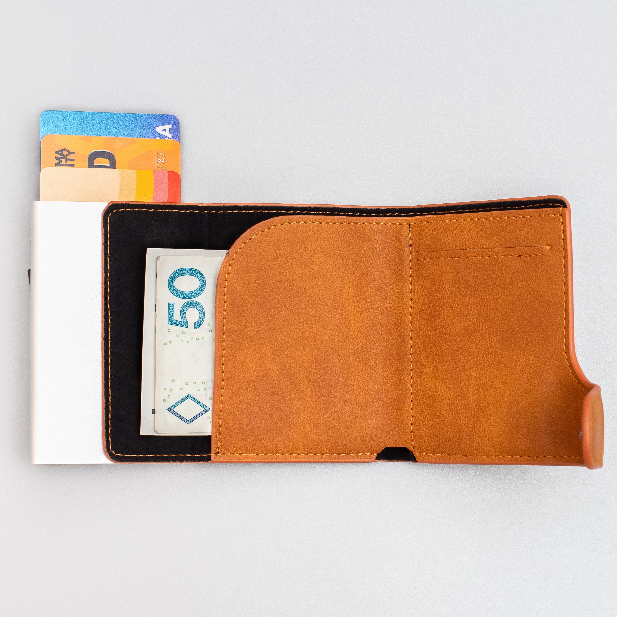 Dzięki blokowaniu RFID karty zbliżeniowe wewnątrz etui są chronione przed odczytaniem danych. Żeby dokonać płatności zbliżeniowej konieczne jest wysunięcie karty z etui. Jest to dodatkowo forma zabezpieczenia, dzięki temu rozwiązaniu to ty decydujesz kiedy twoja karta płatnicza zadziała bezdotykowo. Więcej na ten temat znajdziesz tutaj Jak działa Portfel RFID?